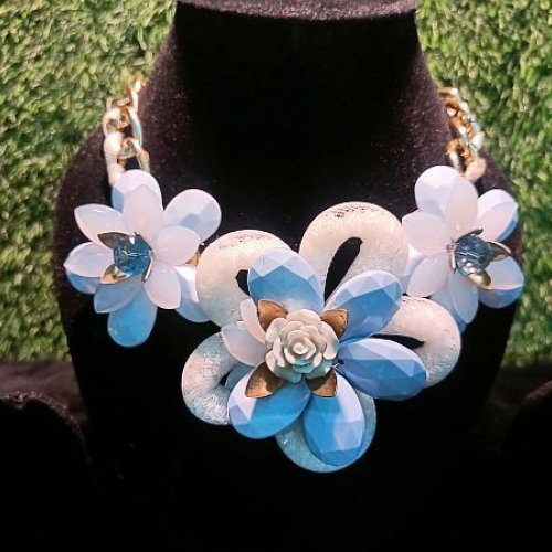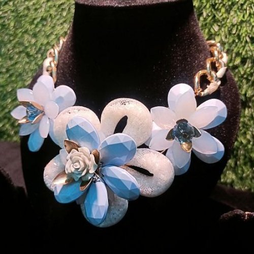 White and Sky Blue Flower Design Statement Necklace